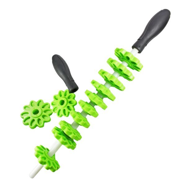 Adjustable Trigger Point Massage Stick Muscle Roller Bar Gym Sports Massager. Adjustable Massage Stick has 12 reconfigurable cogs. Massage Bar has ergonomic handles which can be removed to allow the cogs to be configured as desired. Trigger point massage stick decreases muscle aches and pains. Adjustable massage stick improves flexibility and stimulates circulation. Trigger point roller stick is effective massage therapy for muscles. Massage Bar is 17” and cogs range from 1.9” to 2.6” diameter