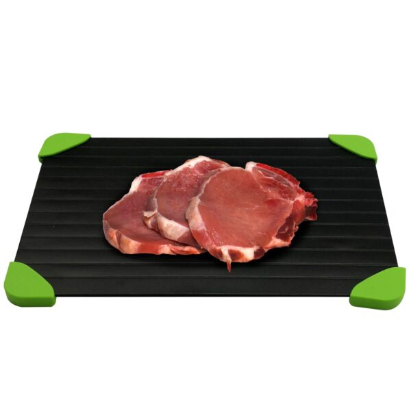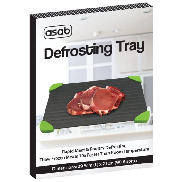 The ASAB Defrosting The defrosting tray provides you with a safe and easy way to defrost frozen meats & poultry. Avoid using microwaves to defrost your food, which not only partially cooks your food but also reduces flavour and attracts bacteria. The cool touch aluminium tray defrosts meat 10x faster than leaving it at room temperature.