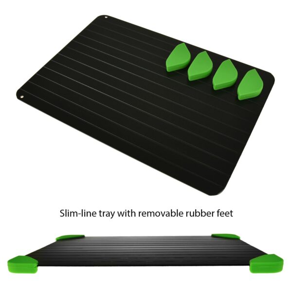 This defrosting tray features removable non-slip corners that allow you to rest it firmly on any kitchen counter surface, they also allow you to wash the tray in the dishwash.