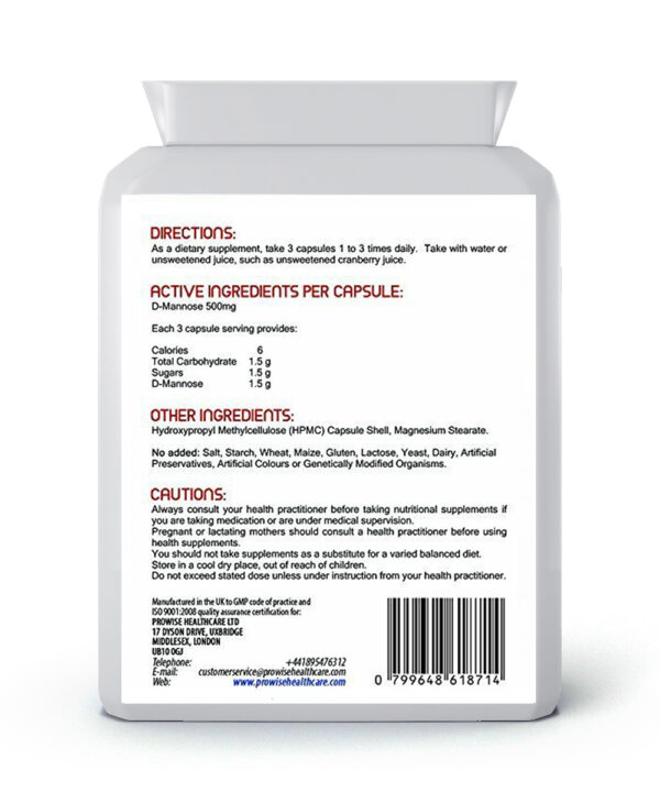 Prowise D-Mannose capsules are manufactured in the UK to GMP code of practice and ISO 9001 quality assurance certification. Only the finest quality raw materials in their highest and purest form are used.