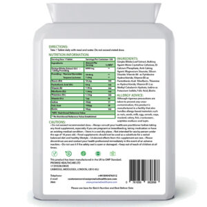 Gingko Biloba Leaf Extract 50:1 – 120mg Providing, Bulking Agent: Micro Crystalline Cellulose, Di Calcium Phosphate, Anti-Caking Agent: Magnesium Stearate, Silicon Dioxide. Providing: Flavone Glycosides 28.8mg, Terpene Lactones 7.2mg, Vitamin B6 1.4mg as Pyridoxine Hydrochloride, Vitamin B5 as Pantothenic Acid (B5)6mg, Riboflavin (B2) 1.4mg, Thiamine(B1) 1.1mg as Hydrochloride, Vitamin B12 1µg as Methyl Cobalamin Hydrate, Niacin (B3) 16 mg, Iodine as Potassium Iodide 25µg, Folic Acid 100µg, Biotin 50µg.
