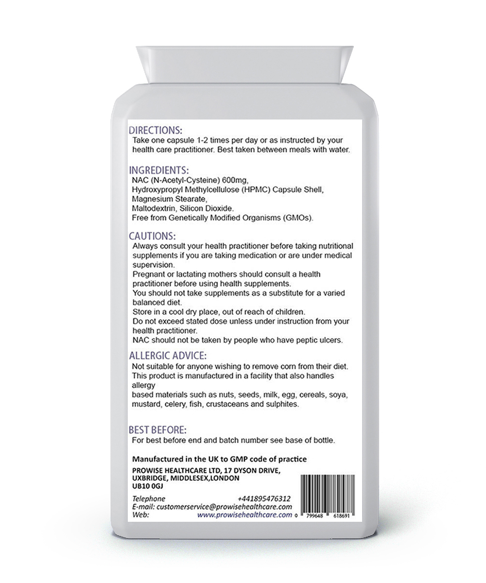 NAC N-Acetyl-Cysteine is an amino acid that supports the production of the powerful antioxidant glutathione. Supplements containing NAC have been shown to support natural healthy levels of mucus within the respiratory tract. N-Acetyl Cysteine is a stable form of L-Cysteine, a non-essential amino acid. It acts as a stabiliser for the formation of protein structures, and is also promotes the production of glutathione. Prowise NAC can help to support healthy respiratory and cardiac function, whilst also helping to maintain healthy function of certain brain neurotransmitters.